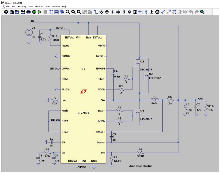 選定合適的硬件、控制器IC和GaN開關之后,可通過詳細的電路仿真來快速獲得初步評估結果。ADI公司的LTspice提供完整的電路模型,可免費用于仿真。這是學習使用GaN開關的一種便捷方法。圖4所示為LTC7891的仿真原理圖。另提供雙通道版本LTC7890。