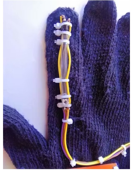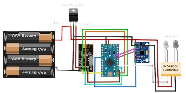 一個(gè)由nRF24L01分線板和Arduino Pro Mini供電的發(fā)送電路連接在手套上。該電路還包含一個(gè)IMU和彎曲傳感器。