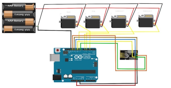 接收電路對(duì)來自發(fā)射器的數(shù)據(jù)進(jìn)行解碼,并相應(yīng)地移動(dòng)四伺服機(jī)械臂。所使用的機(jī)械臂來自MeArm。