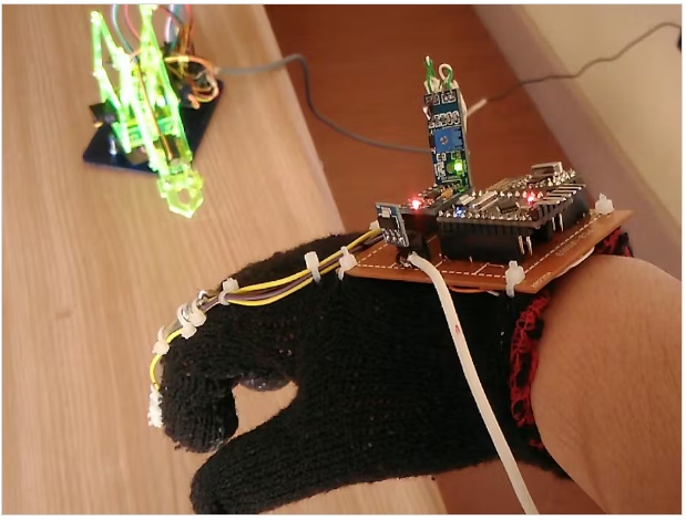 一個(gè)可以用包含IMU和伸縮傳感器的手套無線控制的機(jī)械手臂。