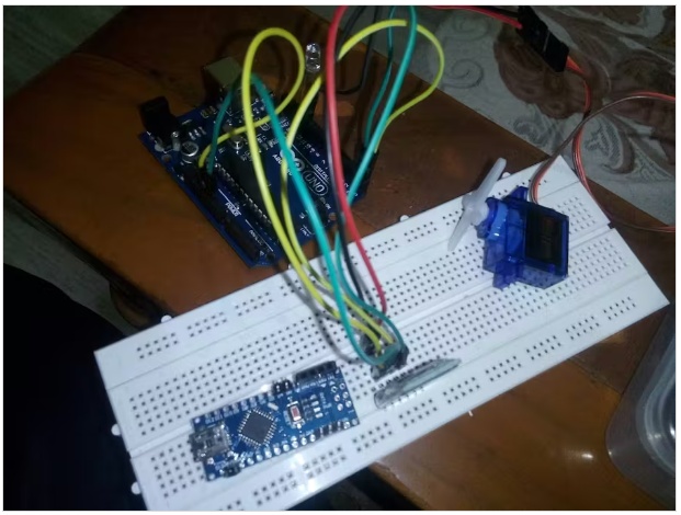 2. 硬件部分由HC-05藍(lán)牙模塊、Arduino Uno和伺服電機(jī)組成。