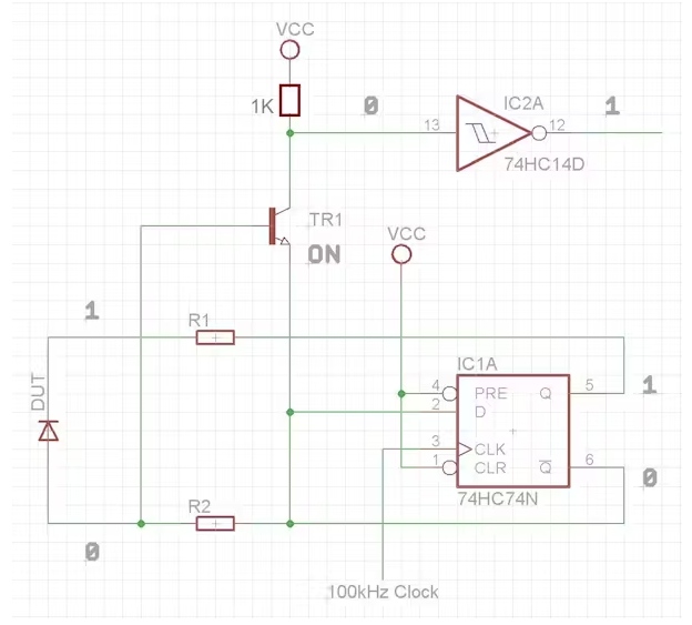 在該電路中,IC1A將每秒施加50,000次正向電壓和反向電壓。當(dāng)Q為LOW和~Q為HIGH時(shí),被測二極管(DUT)將正向偏置并對PN結(jié)上的任何電容充電。TR1的基極電壓低于其發(fā)射極電壓,因此晶體管處于OFF狀態(tài)。這將導(dǎo)致IC2A的輸出為LOW。