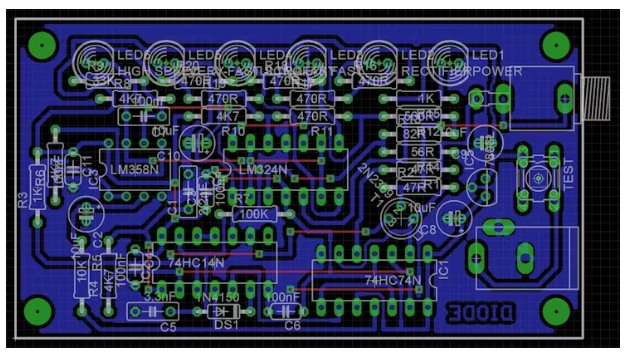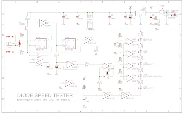 “trr”時(shí)間用于給電容器充電。“trr”越高,充電電容器上的電壓就越高。這個(gè)電壓然后被緩沖和放大,并饋送到由5個(gè)led組成的VU式儀表。