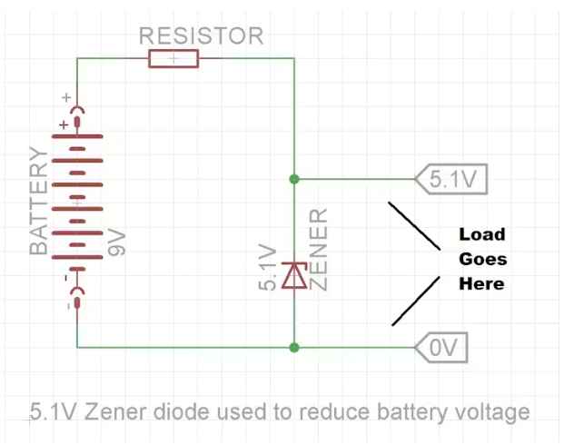 上圖是齊納二極管的典型用法。選擇電阻器值來限制流過二極管的電流。使用歐姆定律,如果齊納二極管被設(shè)計為耗散最大1/2瓦,可以流過它的最大電流是0.5 / 5.1 = 98mA。電阻器需要下降3.9 v,因此電阻器值為3.9 / 0.098 = 39.8歐姆。這是電阻器的最小值。當(dāng)電流被負(fù)載使用時,流過齊納二極管的電流更少。