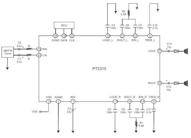 所有功能都可以使用I2C總線進(jìn)行編程。引腳分配和應(yīng)用電路進(jìn)行了優(yōu)化,便于PCB布局和音頻應(yīng)用的成本節(jié)約優(yōu)勢(shì)。PT2315封裝在20引腳DIP/SOP中,引腳對(duì)引腳兼容TDA7315,性能與后者非常相似。雖然全數(shù)字系統(tǒng)可能有一些缺點(diǎn),因?yàn)橐磺卸际腔谝粋€(gè)集成電路和一些外部組件,工作的靈活性與這個(gè)系統(tǒng)在業(yè)余愛(ài)好者端減少。