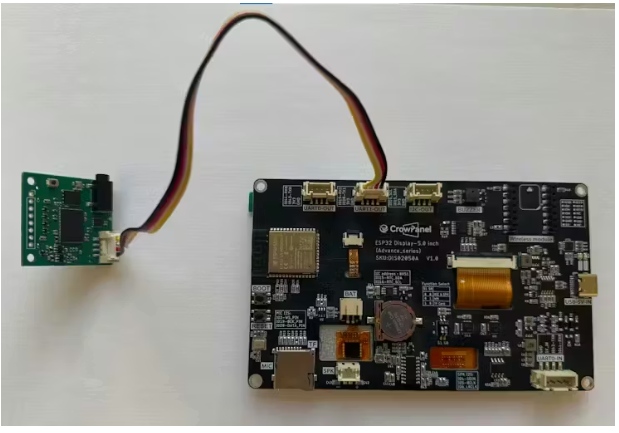 3.閃爍后:用4針電纜將tinyTTS模塊連接到CrowPanel (UART0?UART1-OUT)。將tinyTTS的音頻輸出(3.5毫米插孔)連接到揚(yáng)聲器或耳機(jī)。
