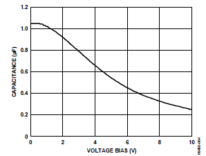 本例中,假定X5R電介質(zhì)在?40°C至+85°C范圍內(nèi)的最差情況電容(TVAR)為0.15(15%)。假設電容容差(TOL)為0.10 (10%),CBIAS在1.8 V下為0.94 μF,如圖4所示。