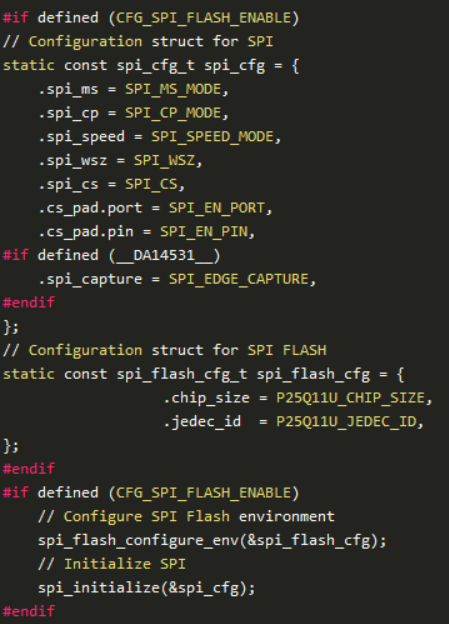 然后在user_perid_setup .c文件中保留并配置SPI gpio,如代碼部分所示。最后,為集成在DA14531MOD上的P25Q11U SPI Flash初始化SPI Flash接口(在perid_init函數(shù)內(nèi)部)。