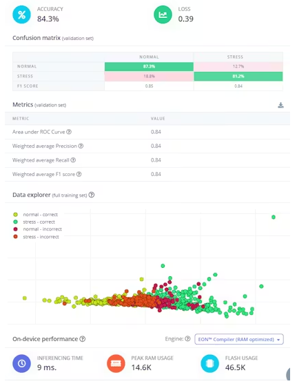 在驗(yàn)證數(shù)據(jù)集上,訓(xùn)練模型的準(zhǔn)確率為84.3%,損失為0.39,加權(quán)f1分?jǐn)?shù)為0.84。當(dāng)使用Edge Impulse的EON編譯器編譯時(shí),該模型顯示出強(qiáng)大的設(shè)備上性能,推理時(shí)間約為9 ms,峰值RAM使用量約為14.6 KB,閃存使用量約為46.5 KB。這些結(jié)果證實(shí)了該模型適用于ESP32-S3上的實(shí)時(shí)、設(shè)備上的蜂窩應(yīng)力檢測(cè)。