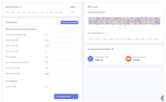 將數(shù)據(jù)集上傳到Edge Impulse后,使用Mel頻率倒譜系數(shù)(MFCC)從原始蜂巢音頻信號(hào)中提取有意義的特征。