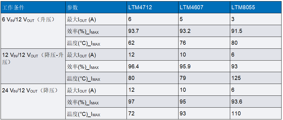 表1.LTM4712、LTM4605系列和LTM8055系列總結(jié)