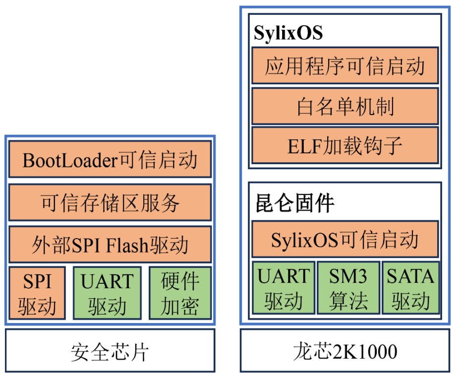 針對嵌入式設(shè)備的安全啟動需求,Zhao等人[11]設(shè)計了一種輕量級的基于安全模塊的可信啟動方法,通過在嵌入式設(shè)備啟動前驗證預(yù)設(shè)信息,確保設(shè)備按照預(yù)定方式啟動,并利用安全模塊對啟動過程中的數(shù)據(jù)完整性進行度量,從而實現(xiàn)可信嵌入式系統(tǒng)。為保證電力系統(tǒng)嵌入式裝置能夠安全可信啟動,張翔等人[12]提出了一種基于可信平臺控制模塊(TPCM)的輕量型可信啟動方法。Liu等人[13]提出了一種將區(qū)塊鏈的鏈上信任擴展到鏈下物理世界的框架,以可信疫苗追溯為例進行了實現(xiàn),包含基于可信執(zhí)行環(huán)境(TEE)的可信環(huán)境監(jiān)測系統(tǒng)和一致性協(xié)議兩部分。Ma等人[14]從高可信嵌入式系統(tǒng)、人工智能嵌入式模型、智能芯片嵌入式操作系統(tǒng)三個方面展開,通過將區(qū)塊鏈共識機制與特定方法結(jié)合來提升系統(tǒng)性能,設(shè)計異構(gòu)計算平臺和混合嵌入式訓(xùn)練系統(tǒng),利用智能芯片增強功能并完成相關(guān)硬件設(shè)計。在基于量子計算的加密方法上,Yu等人[15]研究了部分可信中繼量子密鑰分發(fā)(QKD)網(wǎng)絡(luò)中的密鑰分發(fā)路由問題,提出了一種基于協(xié)作路由的秘密密鑰分發(fā)(SKP-CR)算法。Wang等人[16]提出一種面向無TPM嵌入式智能設(shè)備的可信啟動模型,以解決此類設(shè)備的安全啟動及系統(tǒng)執(zhí)行環(huán)境可信性問題。在航空航天領(lǐng)域,為了提升機載嵌入式計算機的安全防護能力,楊子怡等人[17]在將可信計算平臺引入到機載計算機的基礎(chǔ)上,設(shè)計并實現(xiàn)了基于機載嵌入式可信計算平臺的安全配置管理系統(tǒng)。Yang等人[18]提出基于區(qū)塊鏈的BC-UTSON機制,通過U-PBFT共識、BMWSL信任評估和TPDR可信路由技術(shù),構(gòu)建無人機群可信自組織網(wǎng)絡(luò)以抵御內(nèi)部惡意攻擊并提升安全性。此外,基于可信3.0思想,作者團隊面向特種裝備可信需求,基于“自主可信根 + 龍芯 + 昆侖固件 + SylixOS”的全自主技術(shù)棧,研究并設(shè)計了一種基于雙芯片架構(gòu)的可信執(zhí)行環(huán)境,實現(xiàn)了可信啟動、可信加載、可信運行、可信升級等核心能力,如圖2所示。針對嵌入式系統(tǒng)混合部署與功能安全需求,何瑞琦等人[19]提出DHR-OS架構(gòu),在多核CPU上以Linux為主系統(tǒng)、動態(tài)部署RTOS從系統(tǒng),利用OpenAMP實現(xiàn)通信及驅(qū)動復(fù)用、RPC調(diào)用、中斷路由等協(xié)同機制;設(shè)計調(diào)度–分發(fā)–裁決一體的安全執(zhí)行機制,通過Linux池化RTOS核心、加權(quán)投票共識算法裁決任務(wù)結(jié)果。基于飛騰D2000的測試表明,該架構(gòu)在差模/多模攻擊下可靠性高,為嵌入式系統(tǒng)提供了兼具靈活性與抗攻擊性的新方案。吉晨等人[20]提出基于輕量級虛擬化環(huán)境的可信多級安全容器機制,劃分系統(tǒng)安全域并制定多級安全策略規(guī)則,通過形式化方法證明其安全性,利用聯(lián)合文件系統(tǒng)技術(shù)和以Docker為代表的容器技術(shù)說明技術(shù)可行性,從來源和運行兩方面保證可信性,可改善傳統(tǒng)多級安全機制實用性差的問題。