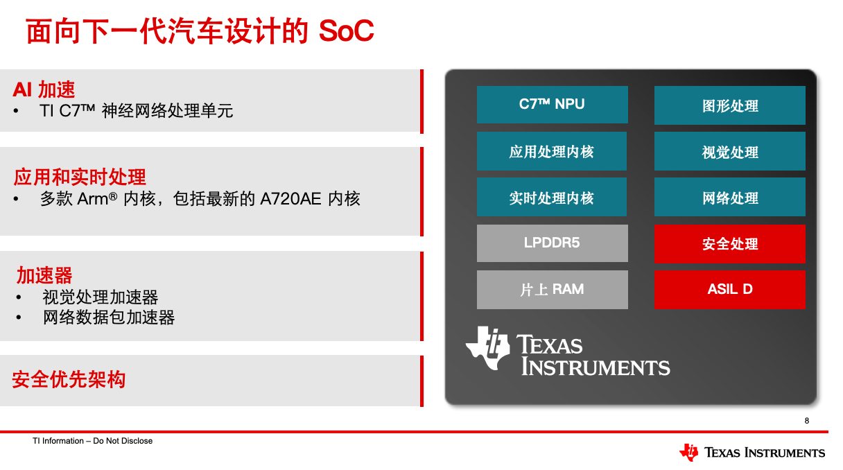 TDA5 的強(qiáng)大性能源于其內(nèi)部高度集成的異構(gòu)計(jì)算引擎。其中最核心的組件是 TI 第七代 C7 神經(jīng)處理單元(NPU)。Roland 回溯了 TI 超過(guò) 40 年的 DSP 研發(fā)歷史,指出 C7 NPU 融合了數(shù)十年的 DSP 技術(shù)與 MMA 加速技術(shù)。與通用的 GPU 方案不同,這款 NPU 專為 ADAS 應(yīng)用設(shè)計(jì),在執(zhí)行大語(yǔ)言模型、Transformer 模型等 AI 工作負(fù)載時(shí),其功耗可降低約三倍——“這是瓦特級(jí)的差距”。
