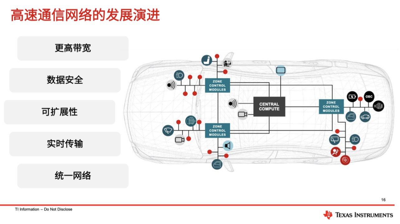 感知產(chǎn)生的海量數(shù)據(jù)與 SoC 需要的實(shí)時(shí)決策,必須依賴高效的通信中樞。德州儀器汽車系統(tǒng)業(yè)務(wù)部總監(jiān) Mark Ng 指出,隨著汽車向軟件定義車輛(SDV)演進(jìn),以太網(wǎng)正逐漸成為統(tǒng)籌各類功能的“數(shù)字中樞”。