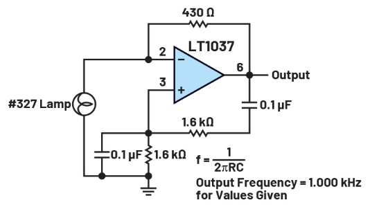 圖1.基于LT1037的1.0kHz文氏電橋振蕩器
