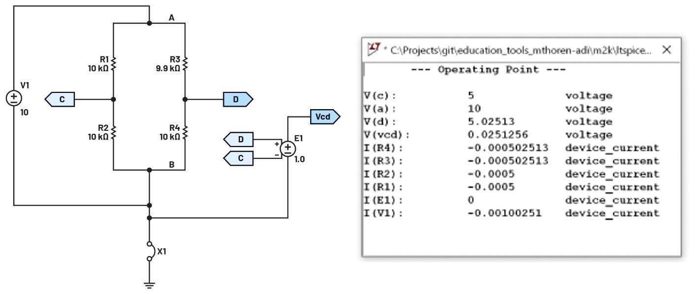 請注意,該電橋初始狀態(tài)為非平衡狀態(tài),因此在Vcd端會產(chǎn)生一個數(shù)值較小但不為零的電壓(此處采用增益為1的壓控電壓源,這種方式能便捷地測量兩個節(jié)點間的電壓差,且測量結果可直接在仿真輸出中顯示)??蓢L試修改R3的阻值進行實驗:取值為10kΩ時,電橋應處于平衡狀態(tài),此時輸出電壓為零。還可嘗試將R1和R2的阻值減小至1kΩ,看看這是否會對輸出電壓產(chǎn)生影響。