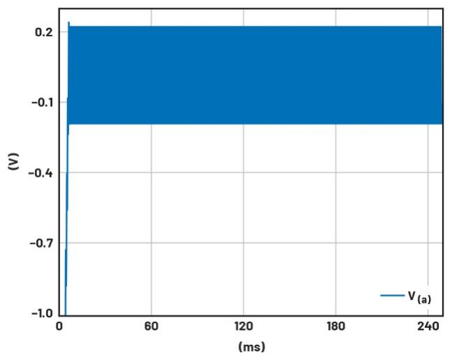 可以發(fā)現(xiàn),電路工作狀態(tài)與理論預測完全一致:在整個250ms的仿真時長內(nèi),振幅始終保持穩(wěn)定。這種現(xiàn)象純屬理論層面,在現(xiàn)實電路或基于實際放大器模型的仿真中均不會出現(xiàn);因為有限的開環(huán)增益、有限的輸入阻抗、失調(diào)電壓以及其他非理想特性,總會導致增益略微高于或低于3。
