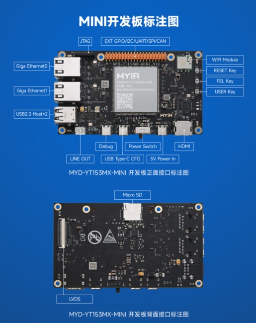 MYD-YT153MX-MINI開發(fā)板采用5V/3A直流供電,板載WIFI模塊,搭載了2路千兆以太網(wǎng)接口、2路USB2.0 HOST接口、1路USB2.0 Type-C Debug接口、1路USB2.0 OTG Type-C、 1路LINE OUT接口、1路兼容樹莓派40pin擴(kuò)展接口、1路HDMI接口、一路JTAG調(diào)試接口、1路Micro SD接口、1路LVDS接口。