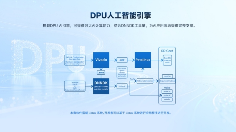 Xilinx®深度學(xué)習(xí)處理器單元(DPU)是專用于卷積神經(jīng)的可配置計算引擎網(wǎng)絡(luò)。引擎中使用的并行度是設(shè)計參數(shù),可以根據(jù)需要選擇目標(biāo)設(shè)備和應(yīng)用程序。 它包含一組高度優(yōu)化的指令,并支持大多數(shù)卷積神經(jīng)網(wǎng)絡(luò),例如VGG,ResNet,GoogLeNet,YOLO,SSD,MobileNet,F(xiàn)PN等。MYC-CZU3EG-V3搭載DPU AI引擎,可提供強大AI計算能力,結(jié)合DNNDK工具鏈,為AI應(yīng)用落地提供完整支撐。