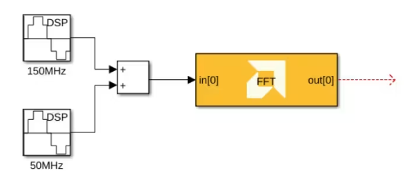 然后為了模擬我們的快速傅里葉變換模塊,我們需要一個(gè)輸入信號(hào)。為此,我使用了來自 MATLAB DSP 系統(tǒng)工具箱的正弦波,這樣它就能生成離散的輸入信號(hào)。我將兩個(gè)這樣的信號(hào)相加,以便得到與上一個(gè)項(xiàng)目中相同的雙音信號(hào)。