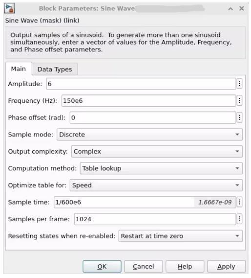 對(duì)于第一個(gè)設(shè)置,我將振幅設(shè)為 6,輸出頻率設(shè)為 150MHz,輸出設(shè)為復(fù)數(shù)形式,采樣頻率設(shè)為 600MHz,每幀的采樣次數(shù)設(shè)為 1024。我還將計(jì)算方法設(shè)置為表格查找,因?yàn)楫?dāng)輸出數(shù)據(jù)為定點(diǎn)數(shù)時(shí)(我將進(jìn)行這樣的設(shè)置)這是必需的。