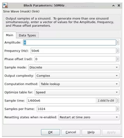 然后我將這個(gè)塊復(fù)制并粘貼,以創(chuàng)建我們輸入信號(hào)的另一個(gè)音調(diào)部分。我只是將振幅調(diào)整為 4,將頻率調(diào)整為 50MHz。