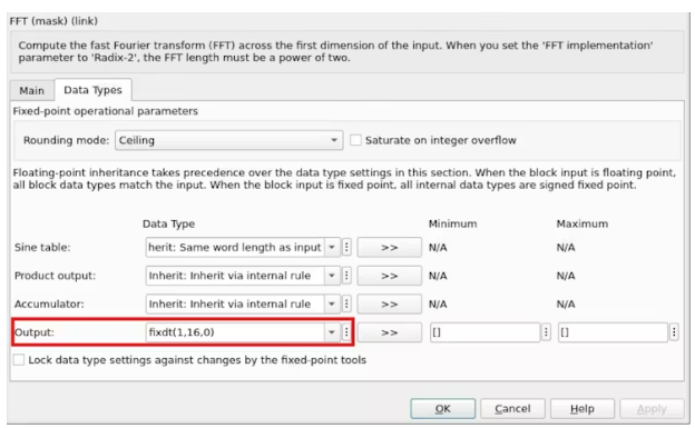 我對(duì)快速傅里葉變換(FFT)模塊所做的唯一修改是將輸出數(shù)據(jù)類型更改為 16 位定點(diǎn)數(shù)。