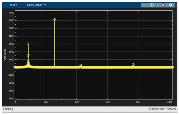 然后,為了驗(yàn)證快速傅里葉變換(FFT)的輸出結(jié)果,我們需要繪制其輸出圖。為此,我使用了 MATLAB DSP 系統(tǒng)工具箱中的數(shù)組繪圖塊。我只想繪制絕對(duì)值,以便僅查看信號(hào)的頻率成分,所以我還添加了一個(gè)“abs”塊。由于 abs 塊在處理復(fù)數(shù)數(shù)據(jù)時(shí)只接受雙精度數(shù)據(jù)類型,所以我還添加了一個(gè)將 FFT 塊的輸出轉(zhuǎn)換為雙精度數(shù)據(jù)類型的塊。