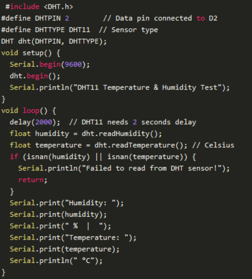 該項目使用 DHT11 傳感器來測量環(huán)境溫度(攝氏度)和相對濕度(百分比),并將測量結(jié)果顯示在 Arduino 串行監(jiān)視器上。