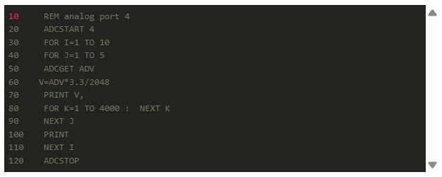 ADCGET [變量] 從 ADC 中獲取“變量”的值 [0 - 2047]