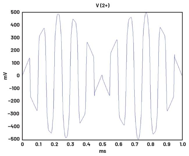 觀察電路的輸出波形。它應(yīng)該類似于圖6所示的仿真波形。