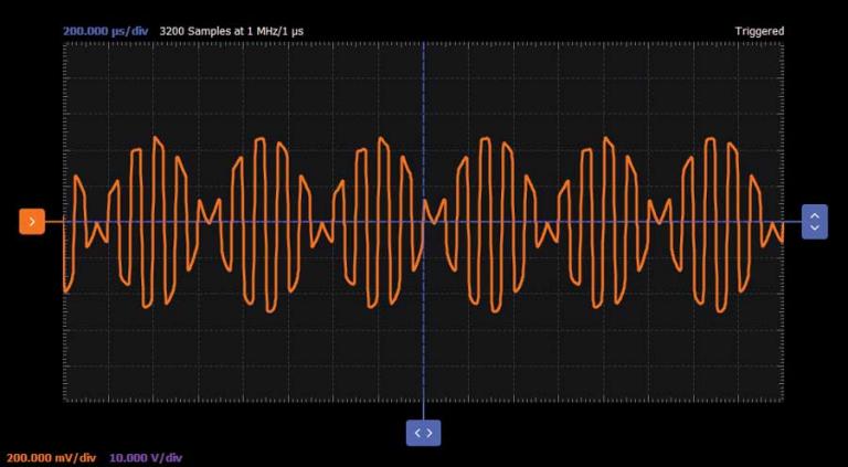 在信號發(fā)生器中:對于W1 (Ch1),設(shè)置公式f(t) = (3 × sin(10×t)) + (0.5 × sin(t)),頻率為1 kHz;對于W2,設(shè)置f(t) = (3 × sin(10×t))–(0.5 × sin(t)),頻率同樣為1 kHz。在示波器中,水平軸設(shè)置為200 μs/div,垂直軸設(shè)置為500 mV/div。運行信號發(fā)生器和示波器,觀察波形。結(jié)果應(yīng)該與圖9中的波形相似。