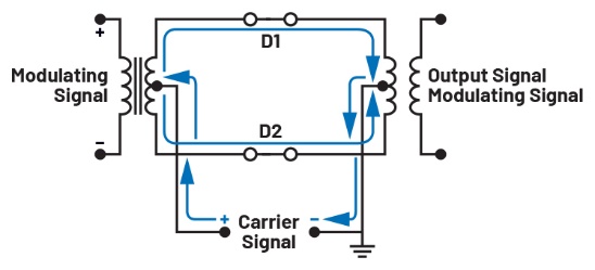 二極管環(huán)形調(diào)制器中使用的二極管可以是硅二極管、硅肖特基勢壘二極管或砷化鎵二極管。這些二極管用作開關(guān),控制輸入信號是否以180°相位反轉(zhuǎn)的方式通過。載波信號以高速率控制二極管的通斷。務(wù)必明白,為使調(diào)制器正常工作,載波的幅度必須顯著大于調(diào)制信號的幅度,通常需要高出約六到七倍。