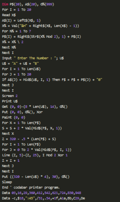 請(qǐng)參考頁面以了解 CODABAR 的結(jié)構(gòu)和編碼方式。以下程序是用 QBASIC 編寫的,可在 QB64 或 QBasic 環(huán)境下運(yùn)行。