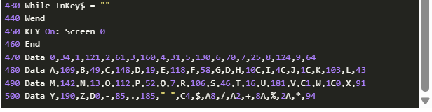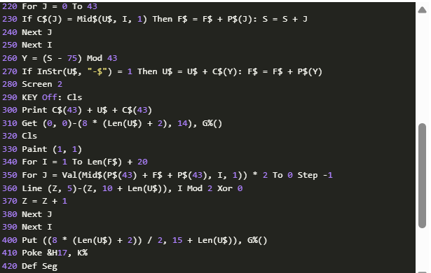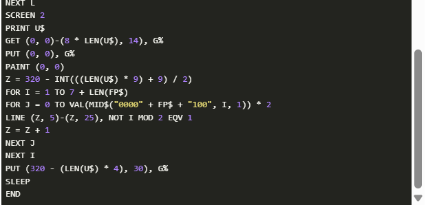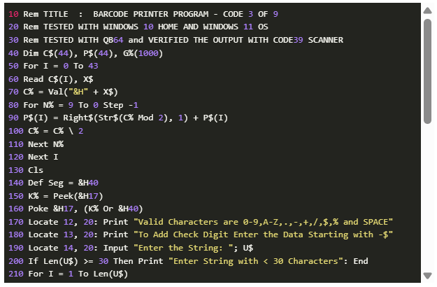 請(qǐng)參考頁面以了解 CODE39 的結(jié)構(gòu)和編碼方式。以下這段用 GW-BASIC 編寫的程序可在 QB64 或 QBasic 上運(yùn)行。