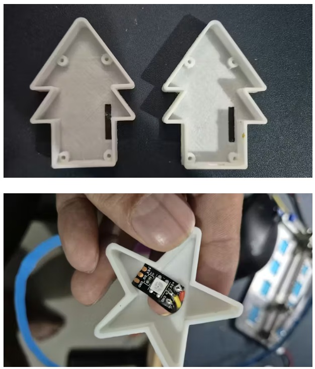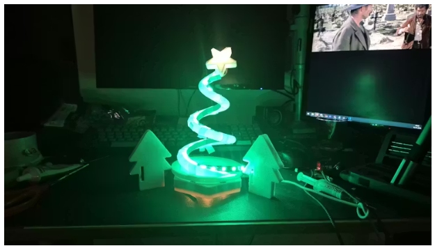 我只有不到一周的時間,所以首先我是在紙上設(shè)計了這個概念,并在 SolidWorks 軟件上制作了模型。然后用圓形管做成了 3D 打印品,管子呈螺旋狀。但我原本認為很優(yōu)雅的螺旋形狀,最終卻變成了一個常見的棕色表情符號的樣子。這時我才意識到,我的機械工程思維完全凌駕于設(shè)計感之上。為什么?圓形截面在結(jié)構(gòu)上比矩形截面更穩(wěn)固,而且能呈現(xiàn)出更好的帶狀外觀。后來我在 Thingiverse 上也找到了一個螺旋結(jié)構(gòu)。我還是繼續(xù)自己重新設(shè)計了這個方案,但隨后 3D 打印過程出了問題,導(dǎo)致材料被弄成了“意大利面狀”,我也沒有時間重新嘗試了。于是我就決定采用圓形管螺旋結(jié)構(gòu)。我把 LED 燈帶纏繞在其周圍,并在頂部加上了一個星星裝飾。