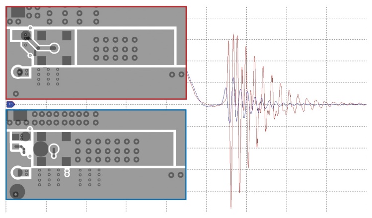 連接器本身是就是一種權(quán)衡的體現(xiàn)。表面貼裝MMCX連接器會(huì)占用電路板空間,這對(duì)于那些要求緊湊布局和高功率密度的設(shè)計(jì)而言,無(wú)疑是一個(gè)問(wèn)題。如果連接器被(理想地)直接部署于FET的柵極和源極引腳之間,且不引入額外的柵極走線,這可能導(dǎo)致布局比預(yù)期更分散。另一方面,若將連接器放置在布局的邊緣,則會(huì)引入額外的走線電感和電阻,進(jìn)而降低測(cè)量準(zhǔn)確度。另一種方案是使用通孔接頭,這些接頭僅用于測(cè)量,在最終裝配時(shí)可移除。但是,這種方案需要借助適配器,不僅會(huì)略微增加寄生效應(yīng),還要在焊盤堆疊結(jié)構(gòu)的所有層上都預(yù)留環(huán)形開(kāi)口。通過(guò)合理權(quán)衡各項(xiàng)因素并優(yōu)化電路布局,可有效抑制探頭寄生參數(shù)引起的過(guò)沖與振鈴(圖5)。紅框中的原始布局將MMCX連接器牢固連接到開(kāi)關(guān)節(jié)點(diǎn),柵極節(jié)點(diǎn)通過(guò)通孔和內(nèi)部走線連接到GaN FET的柵極焊盤。紅色波形顯示振鈴幅度超過(guò)+6.4 V/–9.1 V。仍使用相同的2.2 Ω上拉/1.0 Ω下拉柵極電阻,但修改藍(lán)框中的布局,將MMCX本體與開(kāi)關(guān)節(jié)點(diǎn)分開(kāi),代之以開(kāi)爾文連接,由此測(cè)得的藍(lán)色波形顯示,頂部柵極關(guān)斷時(shí)的振鈴幅度降低至+2.4 V/–1.8 V。值得注意的是,即使只是對(duì)電路布局進(jìn)行些許調(diào)整,也可能顯著影響過(guò)沖的測(cè)量結(jié)果,而這一參數(shù)對(duì)于抑制過(guò)沖并避免GaN FET被過(guò)度驅(qū)動(dòng)至關(guān)重要。