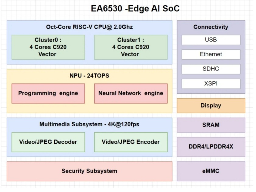 特普斯微電子面向邊緣推理應(yīng)用推出的EA6530 AI SoC,集成四個玄鐵C920高性能RISC-V CPU和24 TOPS的NPU,以及多媒體和安全子系統(tǒng)