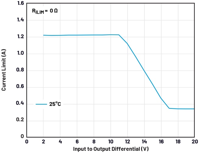 圖5顯示了LT3041 LDO的典型限流折返。注意在圖5中,當輸入輸出電壓差大于11 V時,LDO能夠輸出更小的電流。ADI的許多LDO數(shù)據(jù)手冊都包含一個名為“過載恢復(fù)”的章節(jié),其中解釋了當LDO輸出上的短路故障消除后,為什么限流折返可以阻止輸出電壓設(shè)定值和負載相對較高的LDO恢復(fù)到正確的輸出電壓。