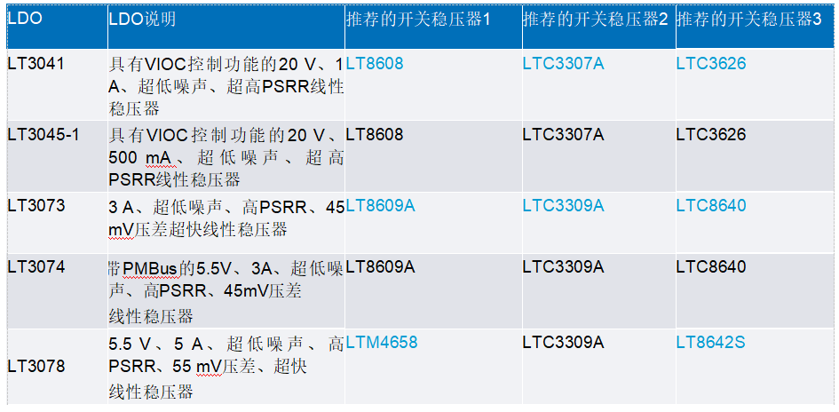 為了簡化設(shè)計過程,ADI提供了指導(dǎo),說明哪些降壓開關(guān)穩(wěn)壓器最適合搭配帶有VIOC特性的特定LDO使用。表1列出了與具有VIOC的推薦LDO組合使用的合適開關(guān)穩(wěn)壓器,并提供了所有LDO的說明。這些搭配基于前面列出的考慮因素,因此在構(gòu)建由降壓穩(wěn)壓器和具有VIOC特性的LDO組成的VIOC電路時,請遵循上文和表1中給出的指導(dǎo)。表1所列LDO的數(shù)據(jù)手冊中提供了許多VIOC電路參考設(shè)計。