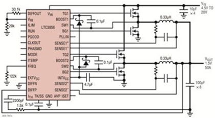 凌力爾特公司擁有好幾款多相 DC/DC 控制器,包括適合大電流 POL 轉(zhuǎn)換的 LTC3856 和 LTC3829 單路輸出同步降壓型控制器。這些器件不僅能夠提升滿負(fù)載效率,而且還具備一種任選的“逐級(jí)遞減”(Stage SheddingTM) 功能,該功能可降低輕負(fù)載至中等負(fù)載時(shí)的功率損耗。圖 1 中的電路示出了 LTC3856 的一款典型應(yīng)用原理圖,該電路用于利用兩個(gè)相位從一個(gè) 4.5V~14V 輸入電壓產(chǎn)生 1.5V/50A 輸出。