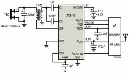 如圖 3 所示,LTC3108 采用一種“系統(tǒng)級”方法來解決一個復雜問題。它可以轉(zhuǎn)換低壓源,并管理多個輸出之間的能量。