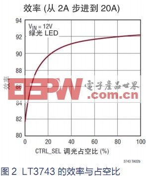 圖 2 顯示 LT3743 的效率怎樣隨著占空比變化,同時用 2A 至 20A 的電流驅(qū)動一個綠光 LED。其他工業(yè)應(yīng)用,諸如激光二極管驅(qū)動器,在脈沖應(yīng)用中也需要這樣的高效率。