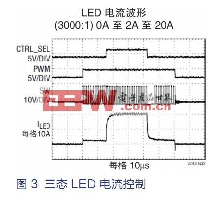 LT3743 運用一種獨特的設(shè)計,該設(shè)計可實現(xiàn)三態(tài)電流控制,面向每一個電流值都具有 3000:1 的調(diào)光比。圖 3 顯示了這些不同的電流值是怎樣控制的。首先,當 PWM 信號變高時,它將 LED 電流設(shè)置為從零到由 CTRL_L 設(shè)定的電流值,在這個例子中,ILED = 2A。然后,當 CTRL_SEL 引腳變高時,ILED = 20A。所有這些電流值都保持 ±6% 的準確度,從而確保一致的亮度。相反,當 CRTL_SEL 變低時,ILED 返回到 2A,而當 PWM 信號變低時,ILED 進入關(guān)斷狀態(tài)。LT3743 單獨的 CTRL_L 和 CTRL_H 控制環(huán)路使這些電流值能夠以約 2ms 的時間非?斓剞D(zhuǎn)換,同時保持非常高的效率。