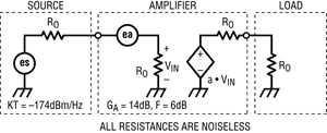 圖6是一個例子。電源噪聲功率是3.98×10-21W/Hz或-174dBm/Hz。放大器的功率增益是14dB,其噪聲指數(shù)是6dB。提供給負載的噪聲功率等于-154dBm/Hz。