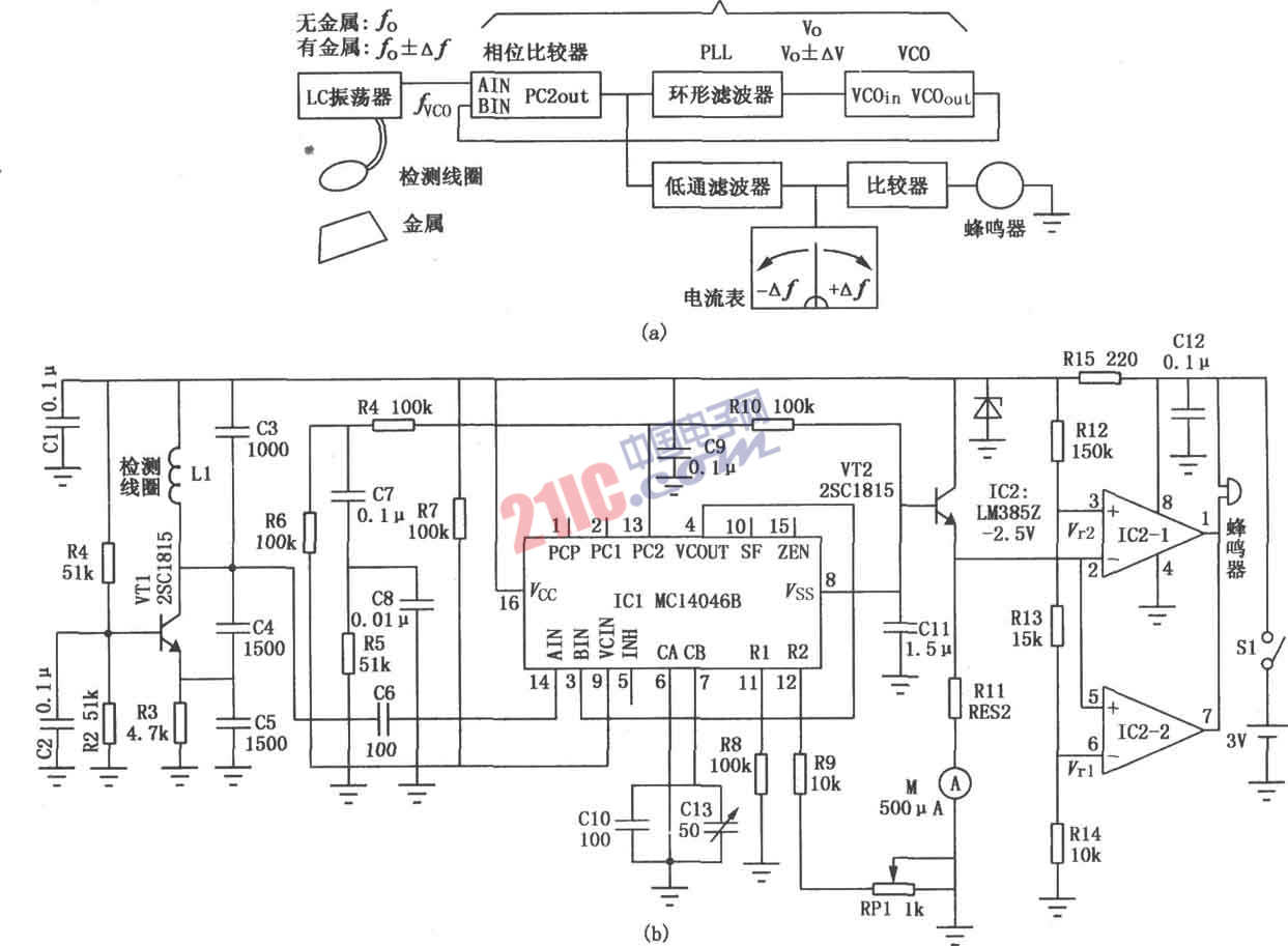 金屬探測器電路如圖所示。探測線圈組成LC振蕩電路,當(dāng)線圈靠近金屬時,金屬體內(nèi)產(chǎn)生渦流,使線圈電感量變化,致使探測器電路中的振蕩頻率也發(fā)生變化。圖(a)是本探測器的原理框圖;圖(b)為檢測電路圖。
