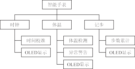 本文設計的智能手表主要具有時鐘功能、體溫實時檢測功能和計步功能,系統(tǒng)功能結構如圖 1 所示。
