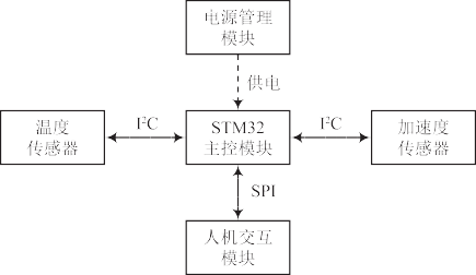 多功能智能手表系統(tǒng)硬件主要由電源管理模塊、主控芯片模塊、溫度傳感器模塊、加速度傳感器模塊和 OLED 液晶顯示器與按鍵組成,硬件系統(tǒng)的組成及連接關系如圖 2 所示。電源管理模塊將不穩(wěn)定的電池電壓轉換成系統(tǒng)需要的 3.3 V 穩(wěn)定電壓,并輸送給各個模塊。主控芯片從溫度傳感器和加速度傳感器獲取采集數(shù)據(jù)并對數(shù)據(jù)進行算法處理,最終通過人機交互模塊顯示出來。