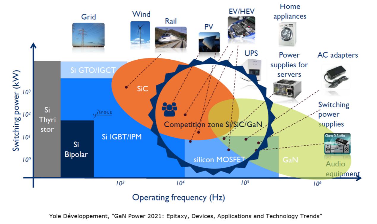 功率器件作為半導(dǎo)體產(chǎn)業(yè)的重要組成部分,擁有非常廣泛的技術(shù)分類以及應(yīng)用場景。例如,傳統(tǒng)的硅基二極管、IGBT和MOSFET等產(chǎn)品經(jīng)過數(shù)十年的發(fā)展,占據(jù)了絕對(duì)領(lǐng)先的市場份額。不過,隨著新能源汽車、數(shù)據(jù)中心、儲(chǔ)能、手機(jī)快充等應(yīng)用的興起,擁有更高耐壓等級(jí)、更高開關(guān)頻率、更高性能的新型SiC、GaN等第三代半導(dǎo)體功率器件逐漸嶄露頭角,獲得了業(yè)界的持續(xù)關(guān)注。