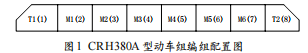CRH380A型動(dòng)車組由6輛動(dòng)車、2輛拖車共8輛車構(gòu)成 編組。編組配置如圖1所示,其中T1、T2為拖車,M1~M6 為動(dòng)車。
